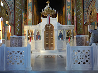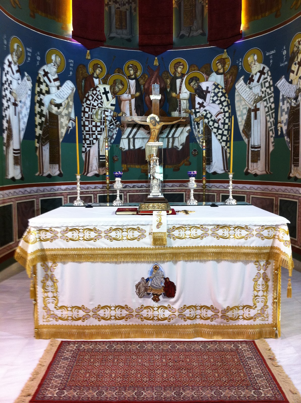 Πίσω από το τέμπλο στο Ιερό Βήμα, υπερυψωμένη κατά μια βαθμίδα ευρίσκετο η αγία τράπεζα.