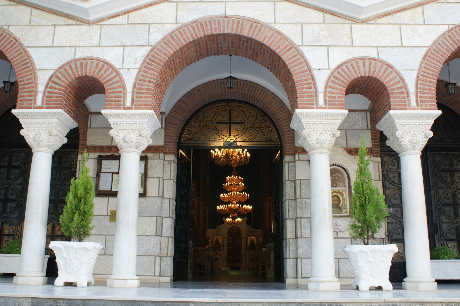 Ανάγλυφα με εκφραστικό τονισμό και ιδιαίτερη καλαισθησία. Φέρουν στο επάνω μέρος σταυρό στηριζόμενο σε καλλιτεχνική βάση με ανάγλυφες ακάνθους και στο κάτω μέρος ακουμπούν σε βάση επίσης με ανάγλυφες ακάνθους καταλήγοντας στηριζόμενοι σε τετράγωνους πεσσούς. Φιλοτεχνήθηκαν από τους μαρμαροτεχνίτες αδελφούς Φιλιππότη, το έτος 2004 και αποτελούν δωρεά της Φεβρωνίας Γεωργ. Κυπριανίδου.